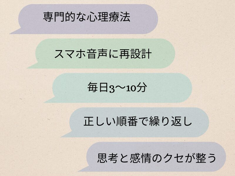 認知行動療法・マインドフルネス・イメージ療法など、専門的な心理療法(セラピー)をスマホ音声で実践できるように再設計しました。