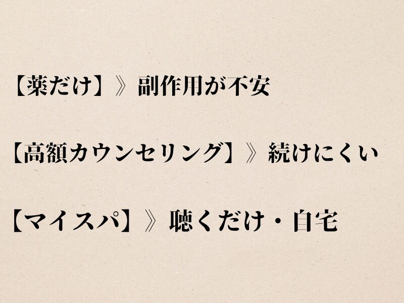 マイスパは、通院や面談がつらいときでも、自宅でスマホを聴くだけで始められる音声セラピーです。